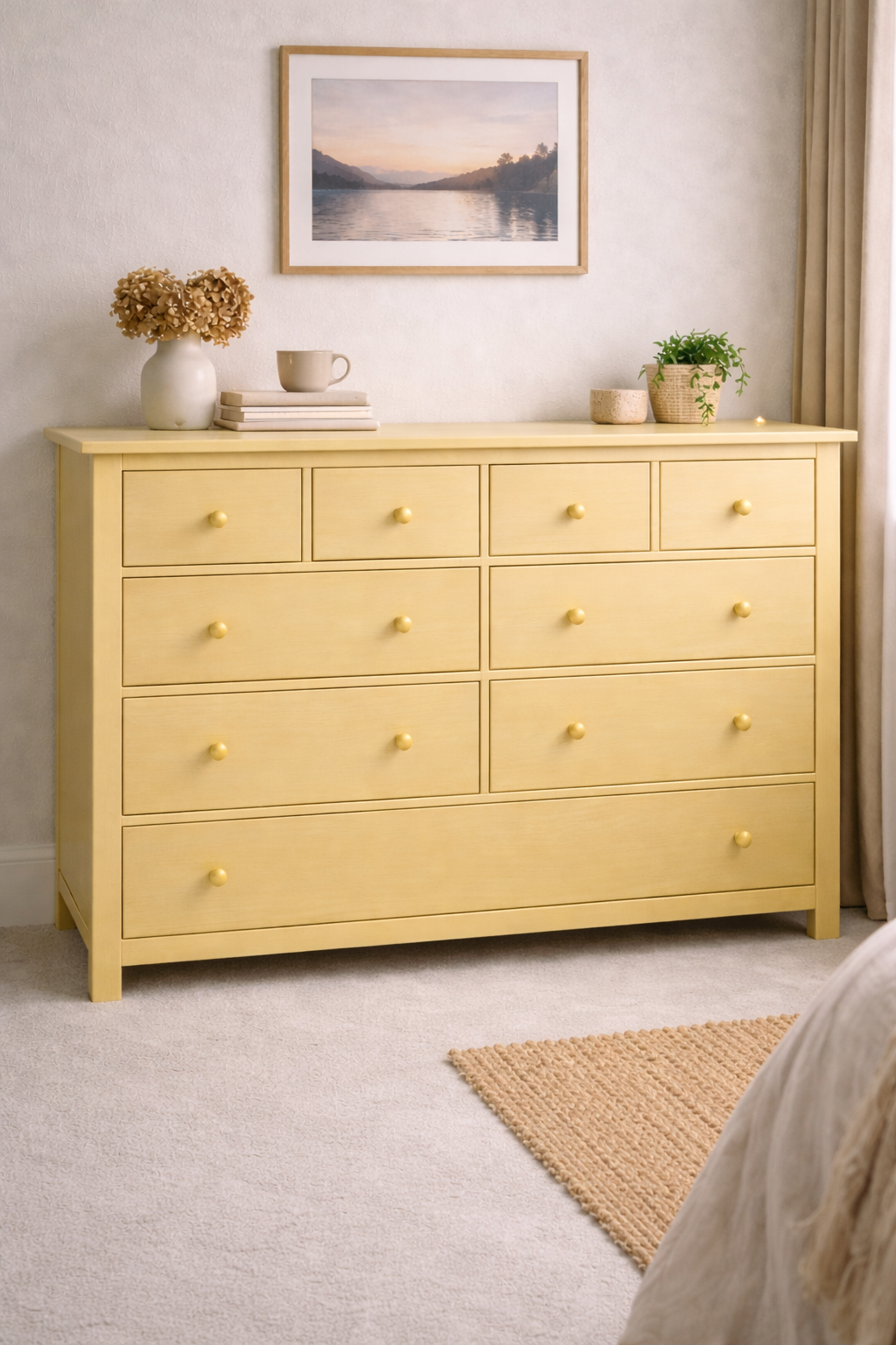 Solskin er en flot sart gul farve, som man bliver i godt humør af, og kan mindes de smukke sommerdage med skønt solskinsvejr. Utrolig flot at bruge, når du skal male møbler eller måske en æske eller trækasse som skal friskes op. Farven er ligeledes rigtig god som maling til din væg, eventuelt i stuen eller på værelset. Stolene er malet med Solskin og efterbehandlet med Ultra Mat Lak. Vandbaseret miljøvenlig kalkmaling, som er utrolig let at arbejde med.