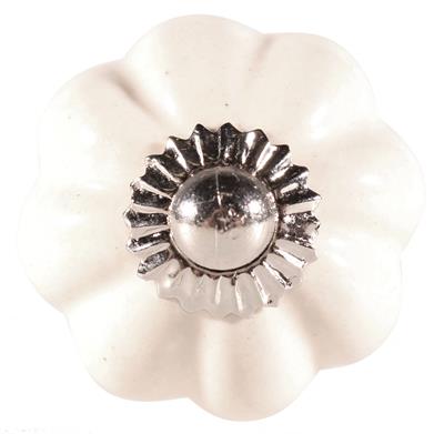 Fineste råhvide keramik og metal knop fra La Finesse. Knoppen er formet som en blomst og med metal roset i midten. Kraven i metal kan vendes den vej du ønsker. Greb / Knop der kan bruges til mange ting. Sæt dit eget præg på dit nye møbel ved at skifte greb. Der er også mange muligheder og inspiration at hente til skuffer, kommoder, eller til en knagerække med forskellige knager efter din egen kreative sammensætning af disse flotte og farverige porcelænsknopper. Knop, greb eller knage, der er mange anvendelsesmuligheder for de flotte porcelænsknager fra La Finesse. Til gennemgående hul, hvoe man saver det overskydende af med en jernsav.